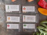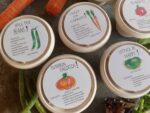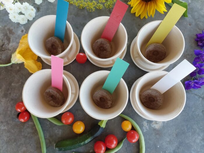 Each kit is packaged in a 2 x 2 inch tall compostable fiber cup made from bamboo and unbleached plant fiber. Each cup/pot contains a mini packet of seeds with instructions for planting, a colorful plant marker and a peat pellet. The fiber pot is topped with a ” saucer” lid which doubles as a pot base. A white card stock circle pictures each vegetable.