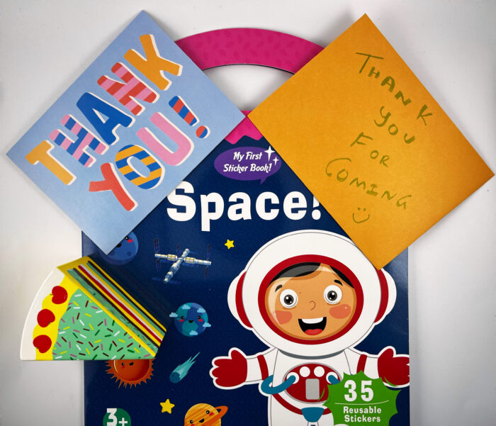What’s included: A space sticker book with reusable stickers, a thank you card, a paper bag. More items can be added upon request.